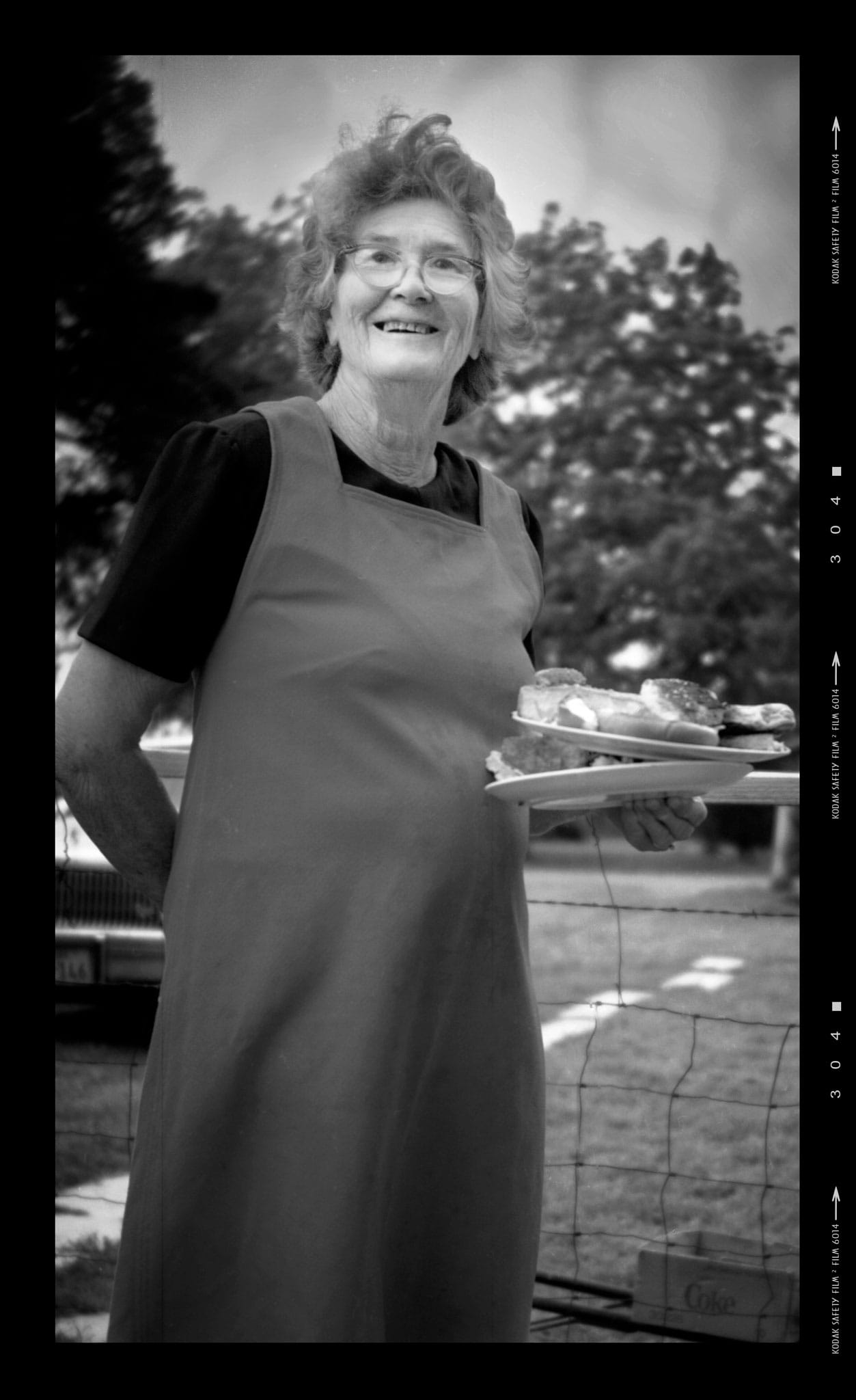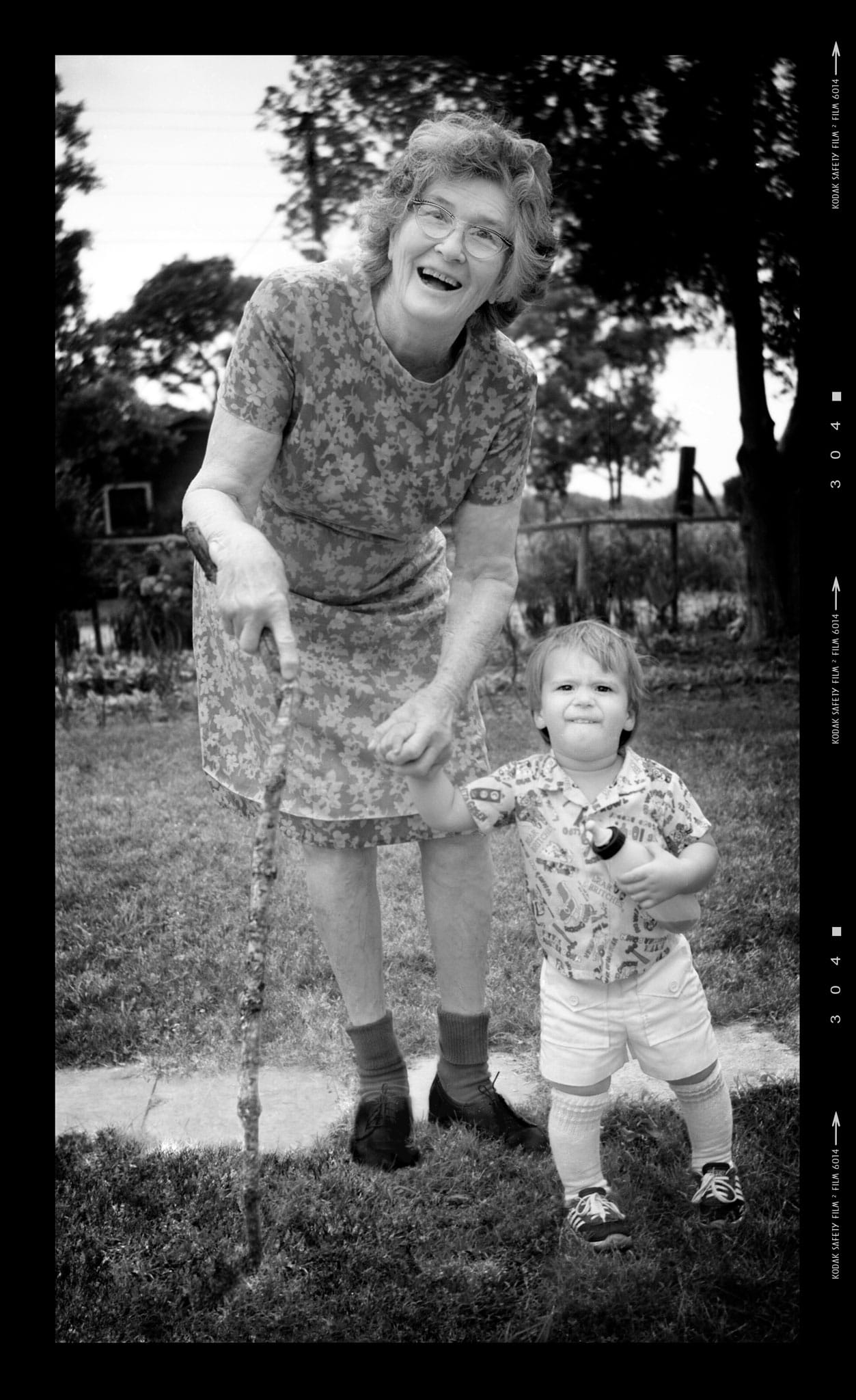 Mama off to feed the dogs (L) and with her first great-grandchild, Walker (R).
